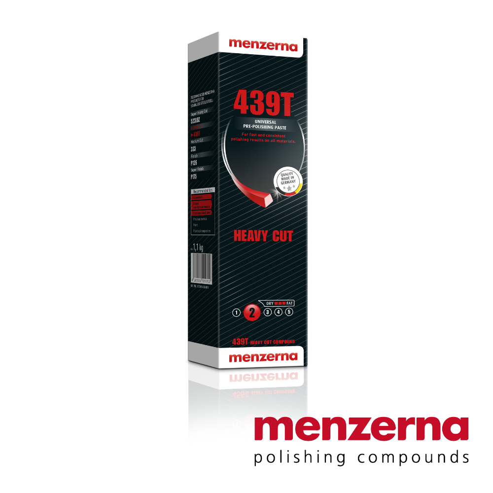 Capable of removing 280 grit sanding marks, 439T is recommended by Menzerna as a first step in a two-stage polishing process. Bring your aluminum or stainless surface to a high gloss by following up with Menzerna 480BLF or P126 Finish compounds. Additional polishing steps can add more clarity. Menzerna suggested processes for: stainless steel and aluminum.