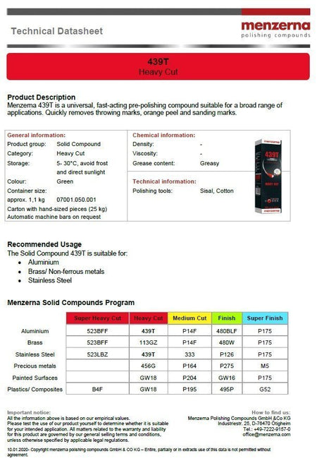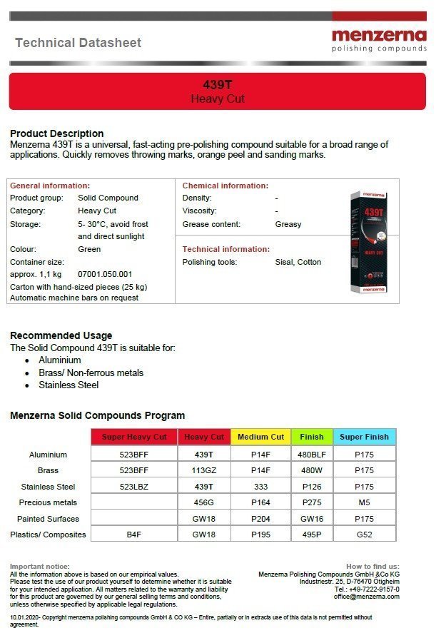 Menzerna 439T quickly removes throwing marks, orange peel and sanding marks from a variety of metal substrates including stainless steel, aluminum, brass, and other non-ferrous metals. High grease content and a low melting temperature means a little goes a long way - do not over-apply!