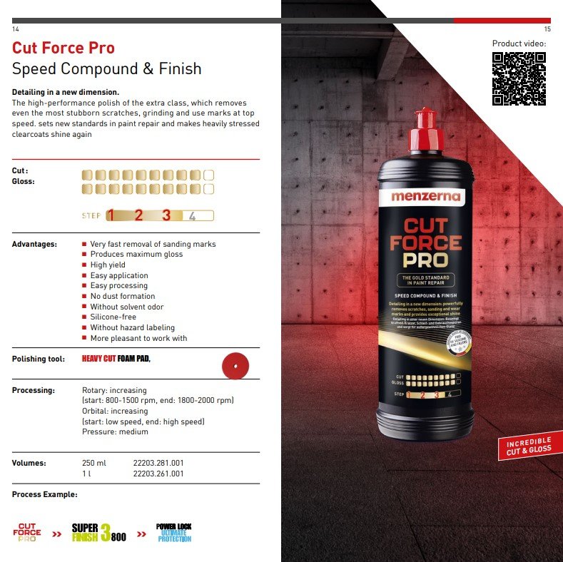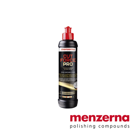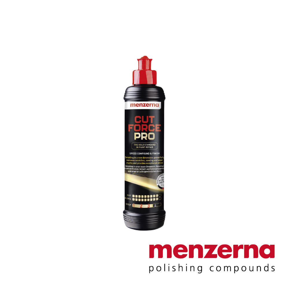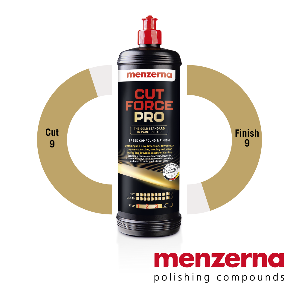 Menzerna's new flagship compound, Cut Force Pro, is a high-performance product in a class of its own that powerfully removes scratches, sanding and wear marks at top speed. Innovative polishing technology from the Menzerna laboratory ensures maximum removal while maintaining excellent gloss. The polish takes paint repair to a new level, restores the shine to heavily used clear coats and creates a noble deep gloss.