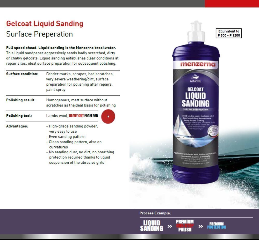 Liquid sandpaper aggressively sands badly scratched, dirty or chalky gel coats without creating sanding dust. This liquid sanding suspension establishes clear conditions at repair sites, resulting in ideal surface preparation for polishing. Get the best results in the least time - gel coats tend to be much thicker, harder, and more porous than clear coat, and as a result this product is formulated with more aggressive abrasives and special chemistry to prevent the liquid from being absorbed before it can be worked over the surface. Automotive compounds will work, but can result in greater product usage, more time spent, and less desirable results.