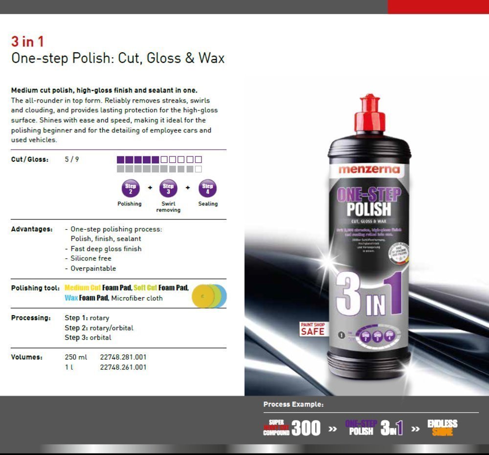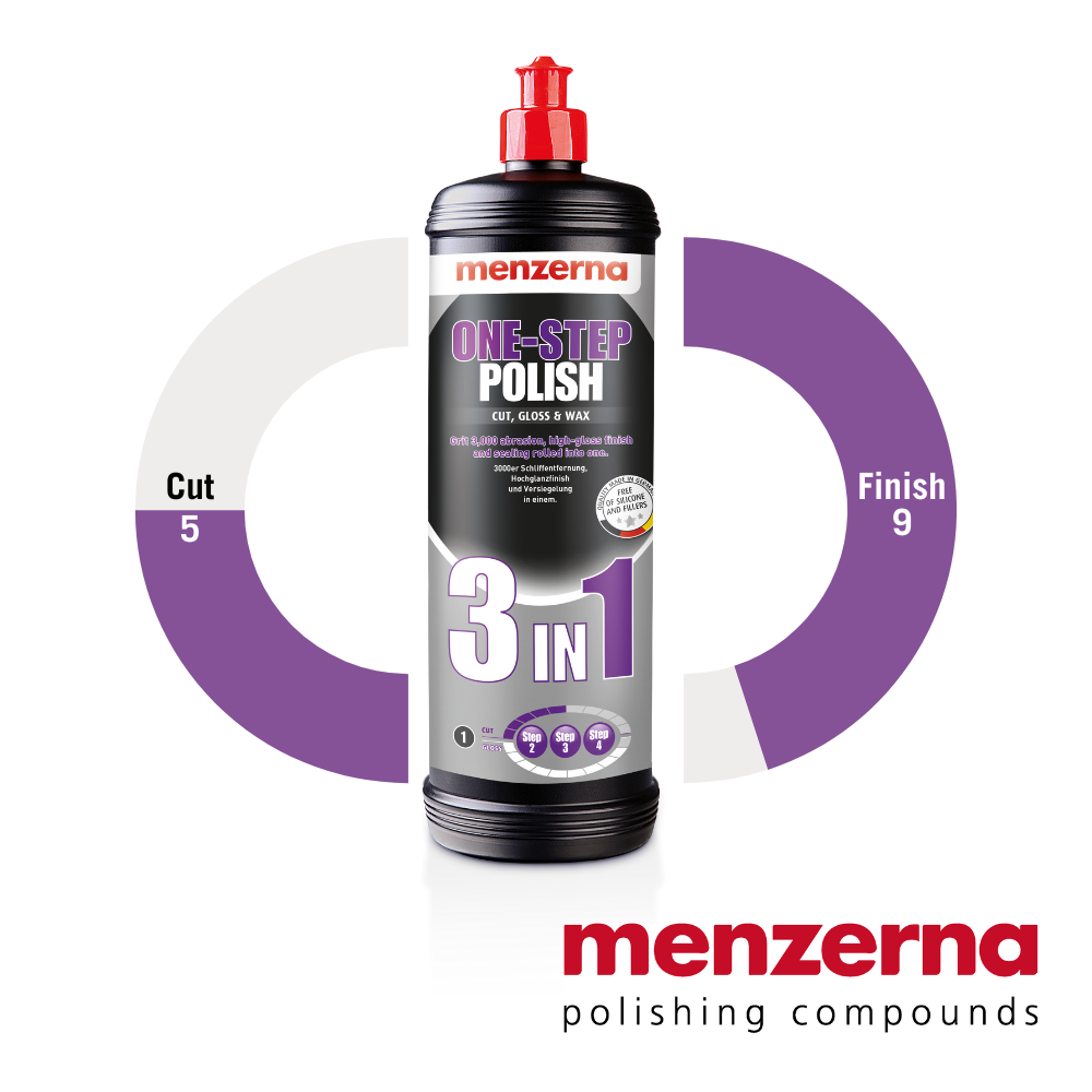 Menzerna's premium all-rounder in top form: One-Step Polish 3-in-1 cuts out 3000 grit sanding marks, reliably removes streaks, swirls and clouding, and provides lasting protection for your high-gloss, finished surface. As a result, Menzerna 3-in-1 shines with ease and speed, making it ideal for professional detailers, automotive dealers, and body shops. Wax lasts up to one-and-a-half (1.5) months.
