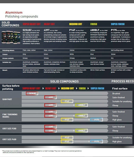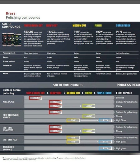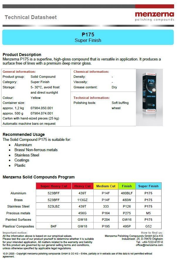 P175 Super Finish is recommended by Menzerna as the final stage in a two- to three-step polishing process and it's suitable for stainless steel, aluminum, brass and other non-ferrous metals, coated surfaces, and plastic surfaces. Additional polishing steps can add additional clarity. Menzerna suggested processes for: stainless steel, aluminum, brass, and coated surfaces.