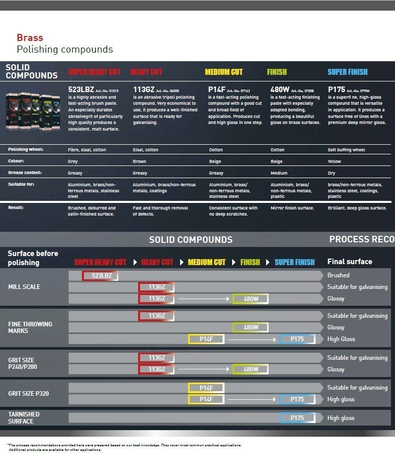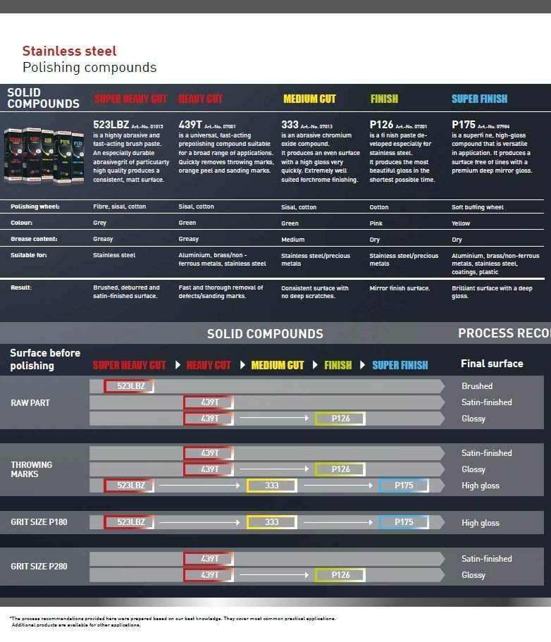 P175 is a superfine, high-gloss compound that is versatile in application. Capable of producing a buff-trail free finish on stainless steel and suitable for use on many metal and other surfaces.