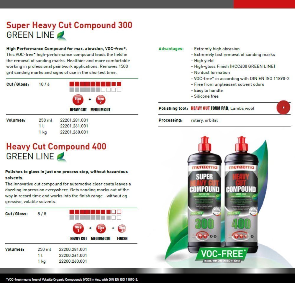 Ideal for professional vehicle detailing and coating, this VOC-free high-performance compound leads in the removal of sanding marks. Menzerna's Green Line Super Heavy Cut Compound (SHCC) 300 removes 1200-1500 grit sanding marks and signs of use in the shortest time without aggressive solvents, resulting in healthier and more comfortable work in professional automotive finishing and paintwork applications.