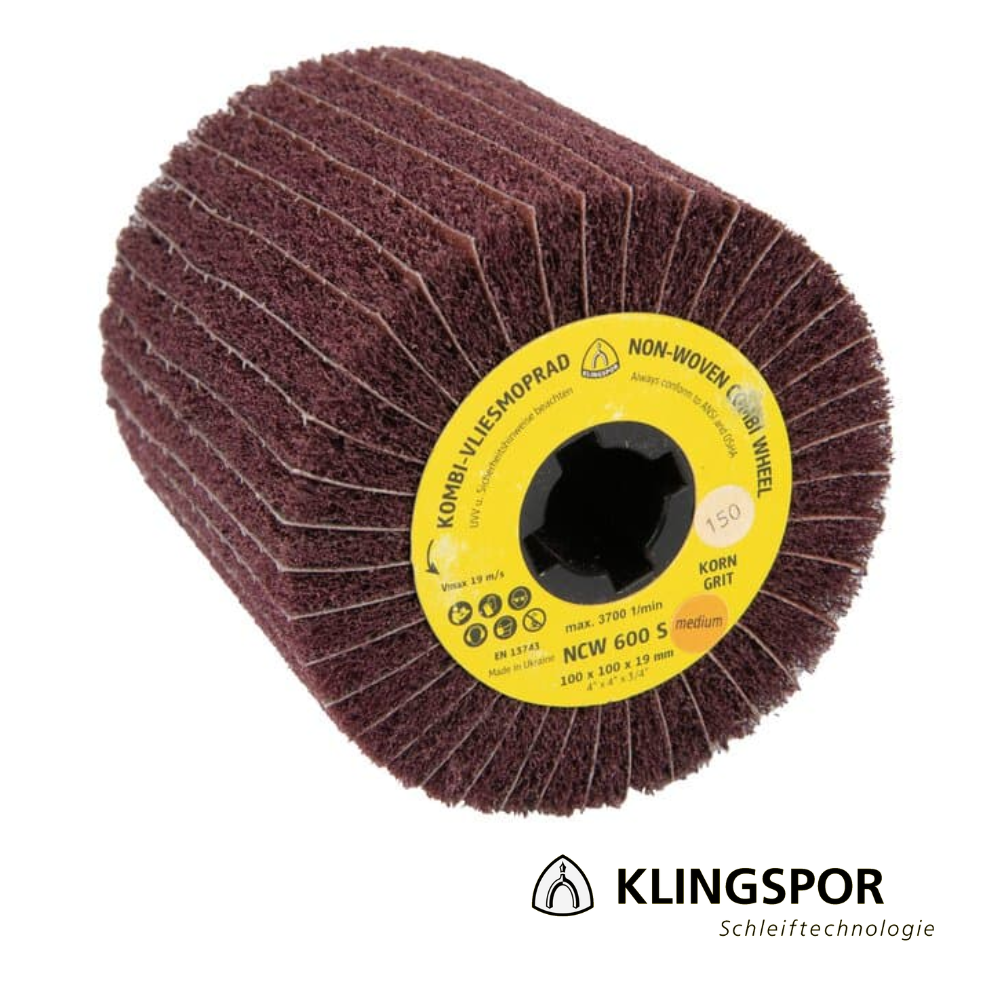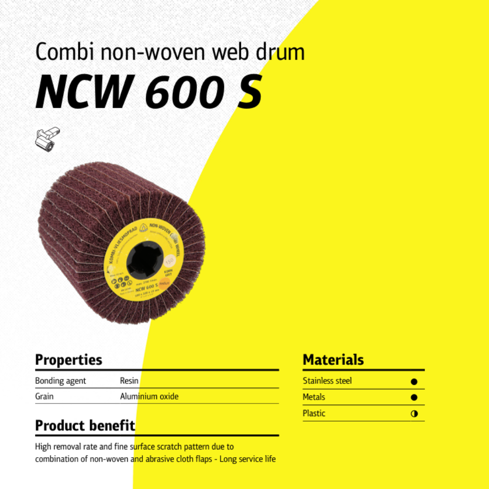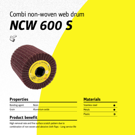 While standard belt and flapwheel operations can produce a coarse brushed finish, the NCW 600 S combines non-woven abrasive and coated abrasive cloth flaps in a radial arrangement to produce an ultra-fine satin finish. As the flaps wear down, fresh grit is exposed to the workpiece, resulting in a more consistent finish over the lifespan of the drum. The outcome is a matte-shiny or matte surface that displays ultra-fine scratches, so-called satin finish lines; utilizing synthetic aluminum oxide abrasive, this satin finishing drum stands out with a combination of surface refinement, effective stock removal, and exceptional surface refinement.