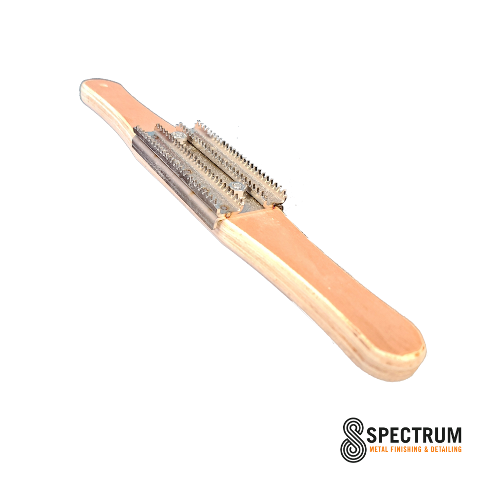 Buffing wheel rakes are designed specifically for edge cut cotton buffing wheels. The main purpose is for cleaning and to remove glazing but they are also very effective at fraying the face of new lathe cut cloth buffs prior to use. Light raking is an essential part of an initial facing and the entire buffing process. Allows for improved compound retention, reduced waste, and higher quality finishes. For optimum performance and life of the head rake buffing wheels frequently and lightly.