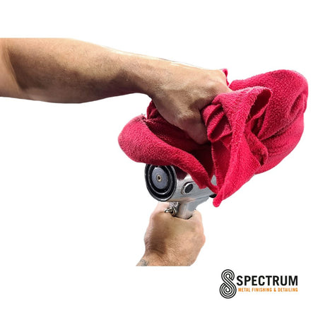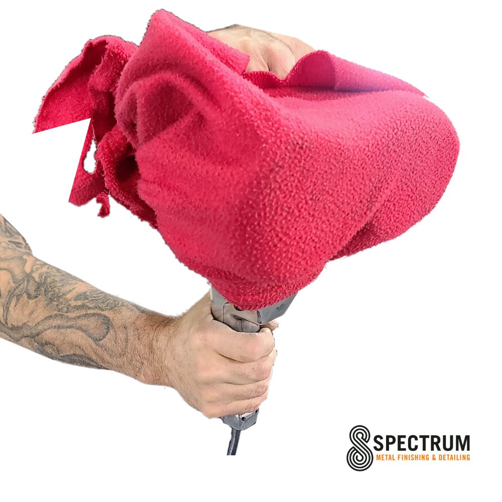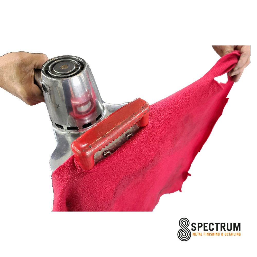 These fleece sheets are pre-cut with slots to allow for ergonomic metal finishing with Rupes Cyclo polishers; the slots fit right over the squared off handle at the top of the machine, allowing you to keep excess material out of the way and use clean areas of the sheet simply by unfolding and rotating! We use the same material in our shop to remove buffing lines from large, flat (or slighly curved) surfaces and produce the finest finishes possible - even on soft metals like aluminum and brass - with our special extra-fine metal polishing cream.