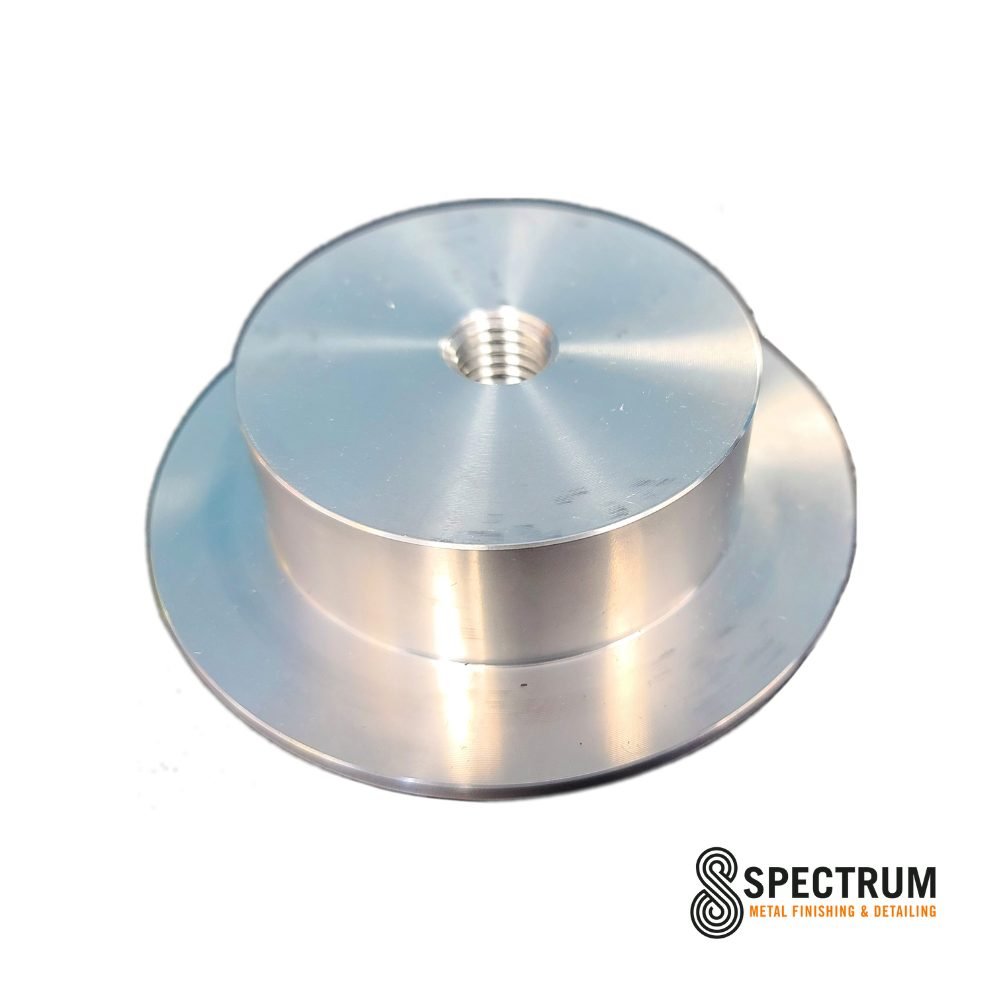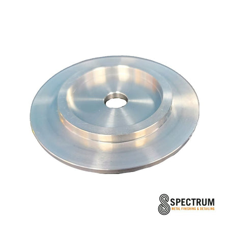 Custom CNC machined aluminum self-centering safety flange for use with 3" center buffing wheels. Mounts two buffs simultaneously. Fit adjusted has been adjusted to match Hilzinger buffs exclusively, forgoing Osborn; virtually eliminates vibration and assures quick mounting of buffing wheels. Mounts directly without the need for an arbor nut.