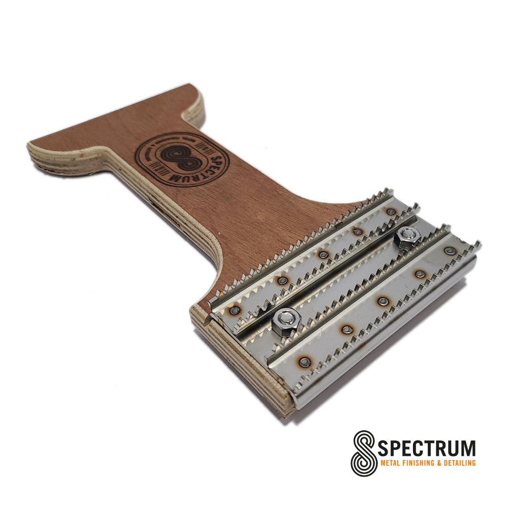 Buffing wheel rakes are designed specifically for edge cut cotton buffing wheels. The main purpose is for cleaning and to remove glazing but they are also very effective at fraying the face of new lathe cut cloth buffs prior to use. Light raking is an essential part of an initial facing and the entire buffing process. Allows for improved compound retention, reduced waste, and higher quality finishes. For optimum performance and life of the head rake buffing wheels frequently and lightly.