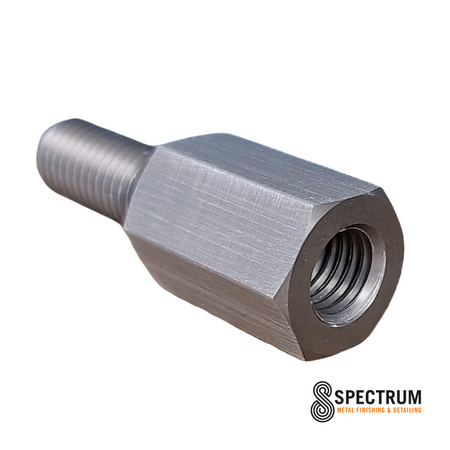 These lightweight aluminum threaded adapters are a perfect solution for those needing additional threads on portable power tools or equipment equipped with a 5/8” arbor. Provides a full 1-1/2” of male threads for exceptional versatility. Hexagon base for easy installation and removal. Recommended for use with our aluminum self-centering safety flanges, for use on especially thick buffing wheels (e.g., non-woven abrasive, sisal, and doubled-up finishing buffs), and for doubling or tripling up multiple miniature/cardboard center buffing wheels. More practically, keeps spinning buffing wheel further from your fingers when holding the grinder head! Now hard anodized for wear resistance and gall prevention.