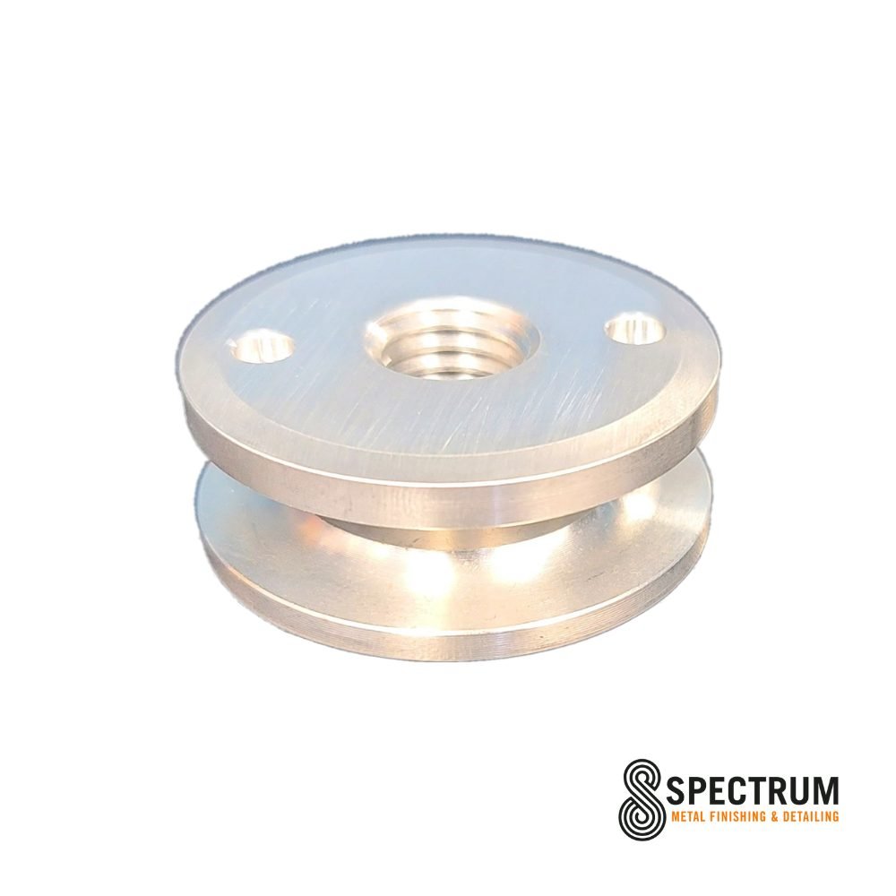 Custom CNC machined aluminum self-centering safety flange for use with 19mm center buffing wheels. Designed to fit Hilzinger-Thum 19mm center miniature airway buffs; mounts one buffing wheel - or two to three buffs simultaneously when used with an arbor extension (works best on small form factor variable speed grinders). Virtually eliminates vibration and assures quick mounting of buffing wheels. Mounts directly without the need for an arbor nut. Can be combined with 5/8-11 adapters for use on drills and flex-shaft tools.
